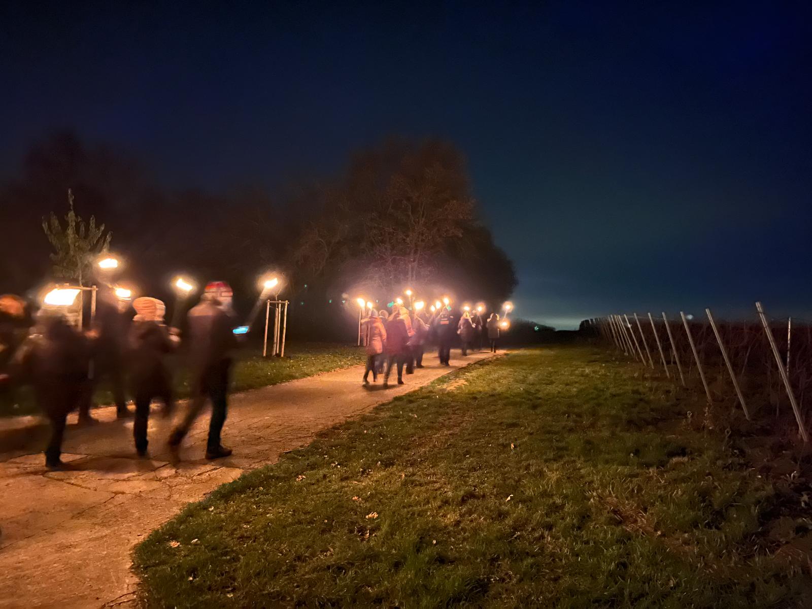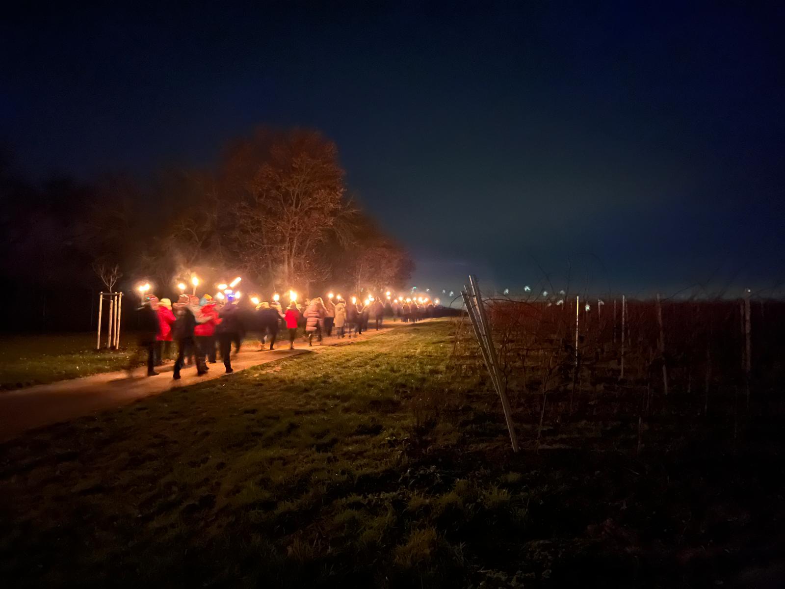 Mit leuchtenden Fackeln in der Hand erkunden wir die Weinberge rund um Stadecken – begleitet von mehreren genussvollen Stopps. An ausgewählten Stationen verkosten wir erlesene Weine aus unserem Weingut, perfekt abgestimmt auf die kalte Jahreszeit. Dazu reichen wir einen herzhaften, warmen Imbiss, der Körper und Seele wärmt.