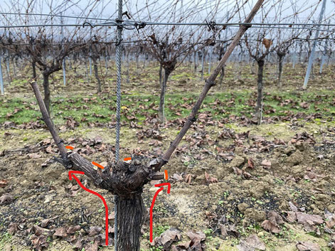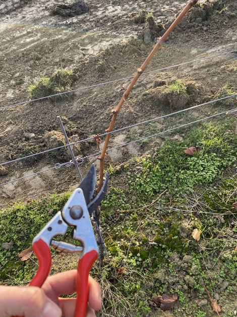 Zum Ende eines jeden Weinjahres steht der Rebschnitt an - eine sehr zeitintensive Arbeitsphase. Jeder Stock muss per Hand mit einer Rebschere "zurückgeschnitten" werden. Das bedeutet, man muss wieder ein Gleichgewicht zwischen den Wurzeln und der Rebe herstellen, um die Qualität zu optimieren. Dafür entfernt man alle "überflüssigen" Rebteile und lässt in der Regel eine einzige Rebe stehen. Aus dieser übriggebliebenen Rebe entwickeln sich im Laufe der nächsten Periode die neuen Triebe und Trauben.